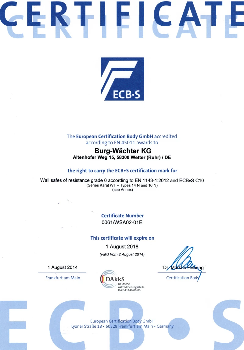 Встраиваемый сейф Burg-Wachter WT 10/5 350 E BIO, или так называемый тайник, – это взломостойкий сейф немецкого производства, который монтируется в специально подготовленную нишу в полу или стене. Его огромное преимущество – «невидимость» для посторонних: при правильной установке сейф почти нереально отыскать. Немалым достоинством является и то, что вынести его из комнаты нельзя, а вскрыть весьма затруднительно: сейф удостоен 1 класса устойчивости к взлому по высоким европейским стандартам, о чём свидетельствует сертификат EN 1143-1 (ECB-S). Все эти факторы обеспечивают исключительно высокий уровень безопасности хранения драгоценностей, денег и документов.